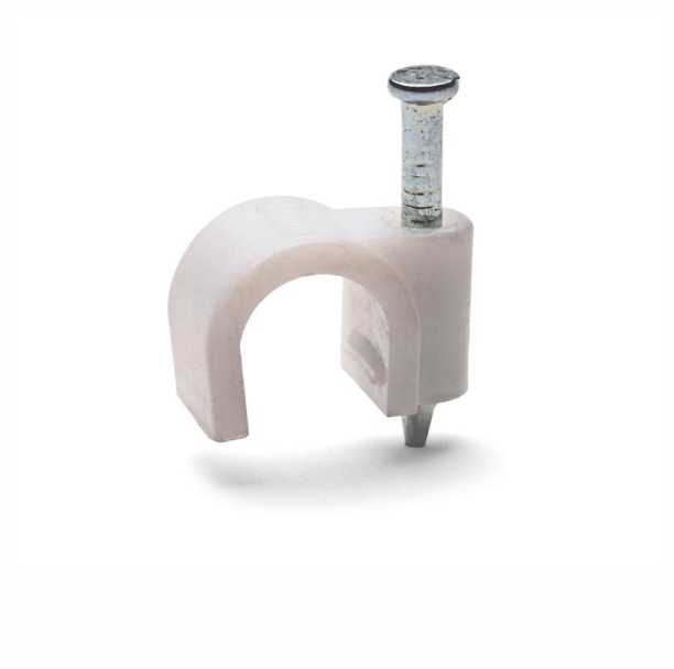 Пластиковые скобы с гвоздем предназначены для крепления круглых кабелей и проводов на поверхностях из дерева и гипсокартона.